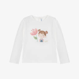 Ivory and blue long-sleeve tee for girls by Mayoral is crafted from soft, stretchy cotton jersey. Adorned with a delightful floral appliqué and charming girl print, it features gathered detailing on the shoulders for added style. With practical popper fastenings, it ensures easy dressing, making it perfect for playful days. Designed for younger girls, this top is part of our exclusive collection, with limited quantities available, so seize the opportunity to add this adorable piece to the wardrobe.