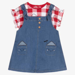Baby girls denim dress and T-shirt set by Mayoral. The pale blue stretch denim dress has cute happy face embroidery on the front pockets, decorative wooden buttons and adjustable shoulder straps. The pink and white check top has a fun little house print, ruffle trims and back popper fastenings.