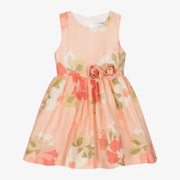 Girls blue floral linen dress by Mayoral, woven in a sustainable linen blend. This lovely sleeveless dress features a blue, ivory, and green floral print, perfect for spring and summer occasions. Lined with lightweight voile and voluminous tulle, it includes fabric flowers at the waist and a keyhole button and hidden zip closure on the back. Limited quantities available, making it a last chance to buy this beautiful piece.