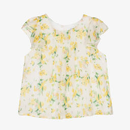 Girls lovely pale blue crêpe chiffon blouse by Mayoral, in a pink and green floral print with a subtle gold pattern for a little sparkle. Sheer and lightweight, it has soft pleated detail on the front and pretty ruffles over both shoulders. It is fully lined for comfort and there is a button fastening on the back for ease of dressing.