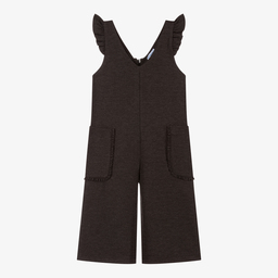 Navy blue jumpsuit for girls by Mayoral, made in soft, mid-weight jersey. It has ruffle trims over the shoulders and on the patch pockets and fastens with a zip on the back.