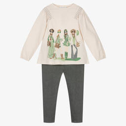 Pretty dusty pink top and blue ankle-length leggings set for girls by Mayoral, both made in soft and stretchy cotton jersey. The tunic length top is detailed with lovely smocking details on the top of the puffed sleeves and a Bohemian-style girls print on the front. The set is made in sustainable cotton.