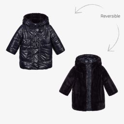 Beautiful, lightly padded navy blue coat for little girls by Mayoral, with a felted wool feel. Fully lined in satin for comfort, it has a smart collar, pleated detailing below the bodice and fabric-covered buttons on the front. This traditional coat contains recycled fibres, reducing its impact on the environment.