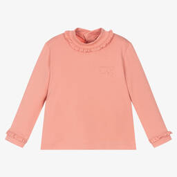 Navy blue turtleneck top for little girls by Mayoral, made in soft viscose jersey. The neck and cuffs have sweet ruffle trims and there is a glittery blue heart print on the chest. It fastens easily with poppers on the back.