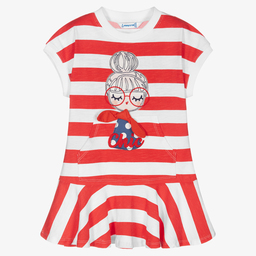 Pretty white and navy blue striped dress for girls, by Mayoral, made in soft cotton jersey. In a relaxed fit, it has a cute little girl appliqué on the front, with a useful front pouch pocket.