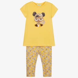 Three-piece top and leggings set for girls by Mayoral, made in soft sustainable cotton jersey. The ivory top has a pink and grey girl print on the front, with a 3D bow trim and 'Cute' written in sparkly diamanté. There are two pairs of leggings, one is dusky pink and the other is light grey. Both have comfortable elasticated waistbands.