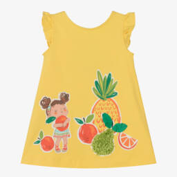 A fuchsia pink mermaid print dress for girls by Mayoral offers an enchanting design with charming features. Crafted from soft jersey, it showcases playful ruffles on the shoulders and a delightful cut-out with a bow detail on the back, enhancing its whimsical charm. Perfect for spring and summer days, this dress provides comfort and style for little adventurers. With limited quantities available, it is the last chance to buy this captivating piece for any young wardrobe.
