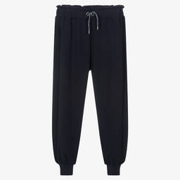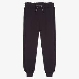 Beige joggers for girls by Mayoral, glittering with shiny gold thread. Made in comfortable polycotton jersey, the waistband is frilled and elasticated with a useful drawstring for a good fit. There are contrasting pale beige bands along the outside of the legs.