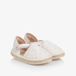 Girls' lace-trimmed espadrilles by Mayoral offer a charming touch to any spring or summer outfit. Crafted with a blend of viscose, linen, and polyester, these shoes feature a delicate lace overlay and a sturdy thermoplastic rubber sole for durability. The cotton and polyester lining ensures comfort during wear, making them perfect for sunny days out. Available in limited quantities, these espadrilles are a must-have for fashion-forward little ones.