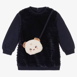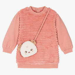 Pretty pale green dress set for little girls, by Mayoral. Made in soft and snuggly plush faux fur, the dress has easily fastening poppers on the back, and stretchy ribbed trims. It comes with a sweet ivory mouse cross-body bag, with a single popper fastening to keep belongings secure.