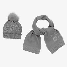 Pretty grey hat set for girls by Mayoral. Made in a soft knit with metallic thread for a touch of sparkle, this hat and matching scarf have adorable embroidered tonal flowers for a pretty finish. The hat has a large faux fur pom-pom for an extra fashionable touch. This item contains recycled materials.
