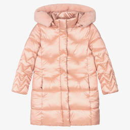 Girls pearl grey long puffer coat by Mayoral. Silky, soft and lightweight, the inside is lined in plush faux fur for warmth. It comes with a zip detachable hood and removable faux fur trim in tonal grey. There is a front zip fastening and popper closing flap over, with two useful side seam pockets with faux fur lining.