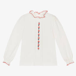 Lovely ivory long-sleeved top for girls by Mayoral, made in soft, comfortable, cotton jersey. The frilled neckline and elasticated cuffs have pretty scalloped red trims, whilst the front has beautiful floral embroidery in red and blue. The top has feminine, puffed sleeves and fastens on the back with a keyhole button fastening.