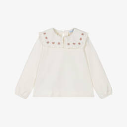 Girls ivory long-sleeved blouse by Mayoral, made in soft jersey for a comfortable feel. This charming top has a ruffle-trimmed collar with pretty pink flower embroidery and a keyhole button fastening on the back.
