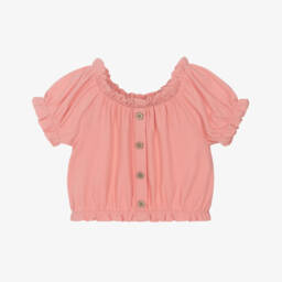 Girls white cropped tee by Mayoral is crafted in a softly ribbed viscose jersey blend, offering both comfort and style. The top features an elasticated hem, collar, and cuffs, adorned with charming flower-shaped wooden buttons, adding a touch of whimsy. The versatile elasticated collar allows it to be worn on or off the shoulder, making it perfect for various occasions. With limited quantities available, it's a last chance to buy this adorable tee for spring and summer.