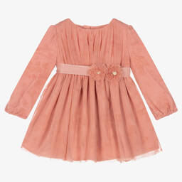 Ivory special occasion dress for little girls by Mayoral, made in layers of soft tulle. It has a beautiful grey flocked floral design and a detachable velvet belt with gorgeous white tulle flowers. The lightweight cotton lining is trimmed with a tulle frill for extra volume, and there is a concealed zip fastening on the back.
