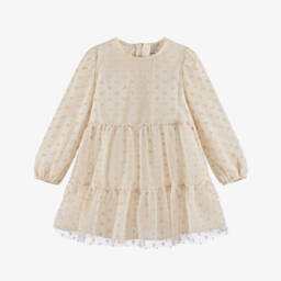 Navy blue dress by Mayoral, designed in a charming and elegant style for little girls. Made in soft tulle, it is embroidered with delicate little bows and trimmed with ruffles. Fully lined in soft cotton for comfort, it fastens neatly on the back with a concealed zip.