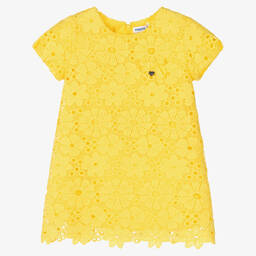 Cute pink A-line dress for little girls, by Mayoral. Lined in soft cotton for comfort, it has a pretty floral lace overlay, capped sleeves and a girly bow charm on the chest. It fastens with a concealed zip on the back for a seamless finish.