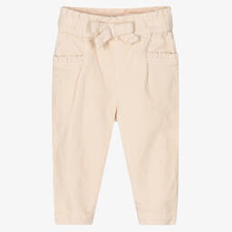 Lovely dark pink trousers for little girls by Mayoral, in a relaxed, slouchy fit. Made in soft cotton corduroy and fully lined, these stylish bottoms have sweet ruffle trimmed pockets, and a cute bow on the stretchy, adjustable waist.