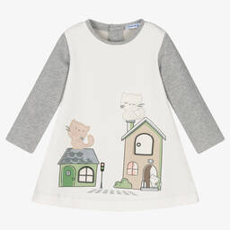 Cute pink and pale beige dress for little girls by Mayoral. Made in soft and sustainable cotton jersey, this casual dress has a sweet village print with faux fur cats and interactive flaps, to spark your little one's imagination.