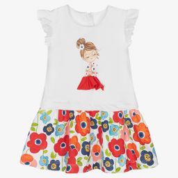 Sweet white and pink dress for little girls by Mayoral, made from soft and stretchy cotton jersey. It has a pretty floral print skirt, and a cute girly print on the front with a pink skirt appliqué. There is a zip on the back for easy dressing.