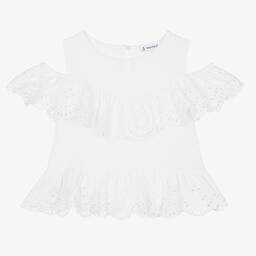 Pink open shoulder T-shirt for girls by Mayoral, with beautiful broderie anglaise ruffle trims. It is made in soft and sustainable cotton jersey and has a neat keyhole button fastening on the back.