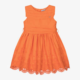 A vibrant pink embroidered cotton dress for girls by Mayoral, featuring a soft, lightweight woven fabric that is perfect for special occasions or a smart day out. The dress has classic pin tucks on the bodice, a removable sash for a bow at the waist, and intricate floral embroidery with guipure lace on the hem. It is sleeveless with a hidden back zip and a ruffle hem lining for added flounce. Limited quantities available.