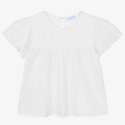 Beautiful coral pink blouse for girls by Mayoral. Soft and floaty, it is made in lightweight cotton with a pretty patterned weave. Pintuck pleats on the bodice and tonal embroidered trims add a special touch. The blouse has a stylish keyhole button fastening on the back.