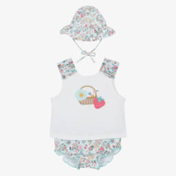 Pink cotton beach set for girls by Mayoral features a charming white bird appliqué with 3D wings on a soft jersey top. The top boasts ruched shoulders and convenient popper fastenings at the back. Paired with silky, stretchy swim pants showcasing a delightful bird and ice cream print, the set is completed with a secure tie-under-the-chin hat. Limited quantities available, perfect for sunny beach days.