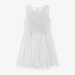 Girls pink chiffon tulle dress by Mayoral, ideal for special occasions. The bodice, made from soft chiffon, features a low cut back with an elasticated fit and a beautifully embroidered tulle overlay in ivory and pink floral patterns. The back opens elegantly with button fastenings, and the lightweight chiffon skirt is fully lined for comfort. Fastened with a concealed zip, this dress is a must-have for any elegant wardrobe, available in limited quantities.