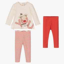 Ivory top and red and blue leggings set for girls by Mayoral, made in soft cotton jersey. The top has fun, printed school motif on the front and fastens with poppers on the back. The red leggings are made in stretchy jersey, while the navy blue ones are gently ribbed. These items are made with sustainable cotton, reducing their impact on the environment.