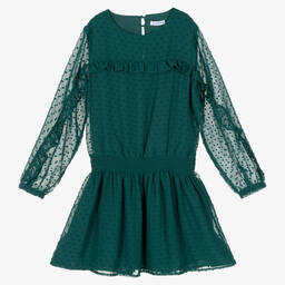 Lovely deep red dress for girls by Mayoral, made in sheer chiffon with plumeti detailing. It has pretty ruffle trims and a stretchy shirred, dropped waist. Lined in lightweight viscose, there are sheer sleeves, and a keyhole button fastening on the back.
