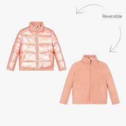 Girls metallic silver reversible puffer jacket from Mayoral. The silver side is made in silky-smooth polyester and the reverse side is in soft black sherpa fleece. Both sides have front pockets and it fastens with a zip on the front.
