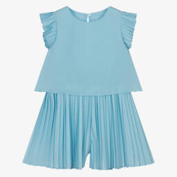 Girls pleated pink playsuit by Mayoral embodies elegance with its beautifully pleated design and vibrant pink hue. Crafted with attention to detail, the playsuit features charming pleated sleeves and a comfortable fit, perfect for spring and summer outings. The back button closure ensures easy dressing, and its lightweight fabric keeps it breathable and stylish. Discover the perfect blend of comfort and style for young fashionistas. Limited quantities available, so don't miss the chance to add this delightful piece to a wardrobe.