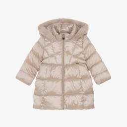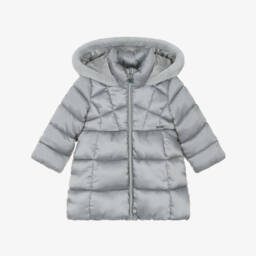 This silver puffer coat by Mayoral is a stylish choice for little girls. Quilted and padded for warmth, it has a soft faux fur lining in the hood and a fleecy lining for extra cosiness. It fastens with a zip and has useful front pockets.