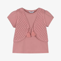 This ivory T-shirt set for girls by Mayoral is crafted from soft cotton jersey, offering both comfort and style. The T-shirt features gently puffed short sleeves, making it ideal for casual wear. Accompanying the T-shirt is a delicate lacy knit waistcoat, complete with tie fastenings and charming tassel trims. Perfect for layering during spring and summer, this versatile ensemble ensures your little one stays fashionable. Limited quantities available, so seize this stylish opportunity today.