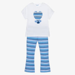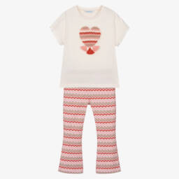 Girls pink zigzag leggings set by Mayoral features a charming combination of a soft cotton jersey top and gently flared leggings. The top has short sleeves with delightful ruffle trims and a large crocheted heart adorned with tassels, adding a playful touch. The leggings, with their vibrant zigzag pattern and elasticated waist, ensure a comfortable fit. Ideal for spring and summer outings, this set is a must-have in limited quantities, offering both style and ease for any occasion.