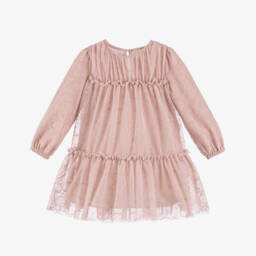 This pretty pink dress for girls by Mayoral is made in delicate tulle with an embroidered heart design. Lined in soft, stretchy jersey, it has a narrow ruffle trim and a button fastening on the back. The sheer fabric is enhanced with sparkly dots that catch the light beautifully.