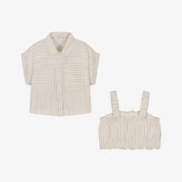 A navy and white striped blouse set for girls by Mayoral is the perfect choice for sunny spring and summer days. Crafted from a soft blend of cotton and viscose, the blouse features fixed turn-ups and button fastenings that open to reveal a charming crop top underneath, complete with frilled, elasticated trims. Easy to wear and ideal for casual outings, this versatile set is available in limited quantities, so seize the opportunity to add it to your wardrobe.
