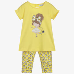 Girls yellow floral outfit set by Mayoral brings a touch of sunshine to any wardrobe. Featuring a soft cotton top with playful fruit prints and two pairs of comfortable leggings, one in solid yellow and the other with a colourful stripe pattern. Ideal for spring and summer outings, this set is perfect for mixing and matching, offering both style and comfort. Limited quantities available, so seize the opportunity to add this charming ensemble to your collection.