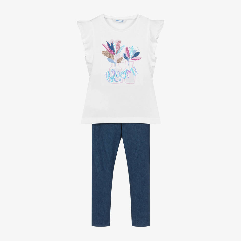 Girls white and blue leggings set by Mayoral features a soft, stretchy jersey T-shirt with charming flutter sleeves and a delightful print of flowers in vases, adorned with beads and sequins for added sparkle. The blue leggings, designed to resemble jeans, have an elasticated waist for easy dressing. Limited quantities available, so do not miss the last chance to buy this stylish and comfortable set.