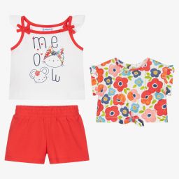 Little girls cute three-piece cotton jersey outfit set from Mayoral. The set includes a pair of yellow pull-on shorts, a ruffled white and yellow top with an adorable leopard appliqué and a cropped top in colourful tropical jungle print.