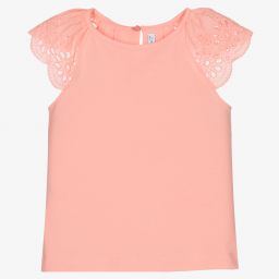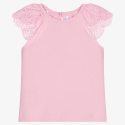 Girls yellow sustainable cotton T-shirt by Mayoral. Made in comfortable jersey, it has pretty broderie anglaise raglan sleeves with scalloped trims. It has a keyhole button fastening on the back.