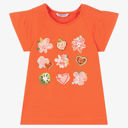 Bright yellow T-shirt for girls by Mayoral, made in soft cotton jersey. Designed with short, pleated raglan sleeves, there is a lovely floral print on the front in a love heart shape. The pretty chiffon flowers are finished with sequins in the centre for added texture and sparkle.