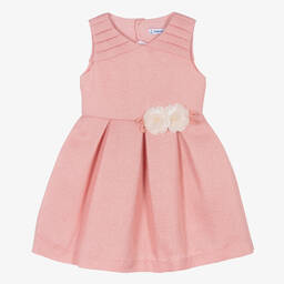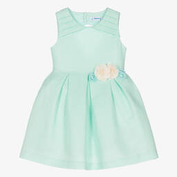 Girls shimmery yellow jacquard dress by Mayoral, lovely for special occasions. Designed with a cut-out back, it has pleated details on the shoulders and a pretty ivory and green flower corsage fixed to the front. There are soft pleats around the waist, creating a beautifully flared skirt. Fully lined, it fastens with a concealed zip and buttons on the back.