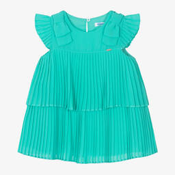 The girls yellow pleated bow dress by Mayoral is a charming piece for your little one's wardrobe. Crafted from lightly textured crêpe chiffon, it features girly bows on the shoulders and a silver logo charm on the front. The dress is fully lined in soft cotton voile for comfort and secures with concealed button fastenings at the back. Limited quantities available, so don't miss your last chance to buy this beautiful dress.