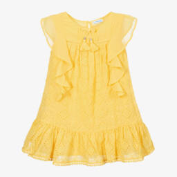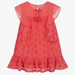 Girls ivory chiffon broderie anglaise dress by Mayoral. Soft and lightweight, it has a ruffled hem with embroidered pom-pom trim, ruffles on the bodice and a plaited tassel with silver metal beads. The dress has a lightweight cotton lining and fastens with a single button on the back.