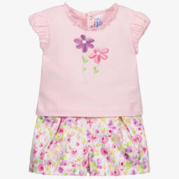 Girls pink bow outfit set by Mayoral features a charming combination of soft pink tones and delicate lace details. The sleeveless top boasts a gentle frill and a delightful bow accent, complemented by matching shorts with a comfortable elastic waistband. Crafted for the spring and summer seasons, this ensemble is perfect for warm days and special occasions. Limited quantities available, offering a last chance to buy this elegant set for young fashionistas.