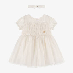 The pink tulle dot dress set by Mayoral offers a delightful ensemble for little girls, adorned with sparkling gold foil dots. Featuring a classic silhouette, the dress includes sheer puffed sleeves, ruching on the bodice, and a full gathered skirt for a charming appearance. Fully lined for comfort, it secures with a concealed zip and is complemented by a matching elasticated headband. Perfect for special occasions, this set is available in limited quantities, making it a last chance to buy.