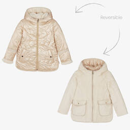Fabulous hooded, padded and reversible blush pink coat for girls by Mayoral, giving two cosy coats in one. One side is made in super soft faux fur, with taped detailing down the back. The pockets have matching trims and fasten with shiny gold poppers. The other side is silky smooth and lovely quilted with jetted, popper-fastening front pockets. Fastening with a zip on the front, this coat contains recycled fibers.